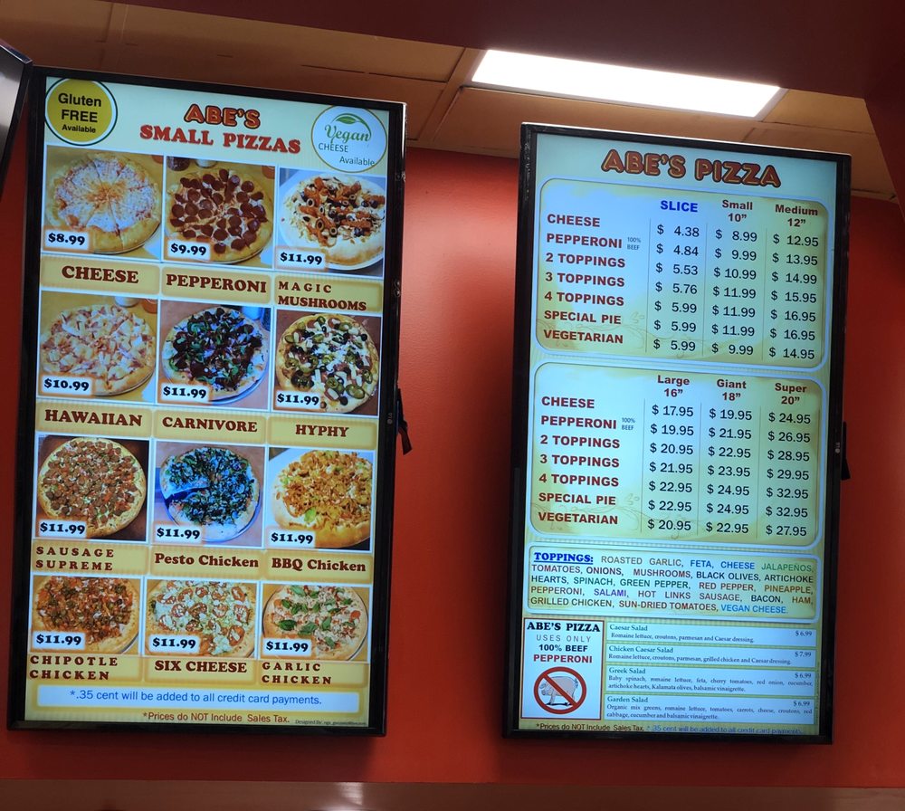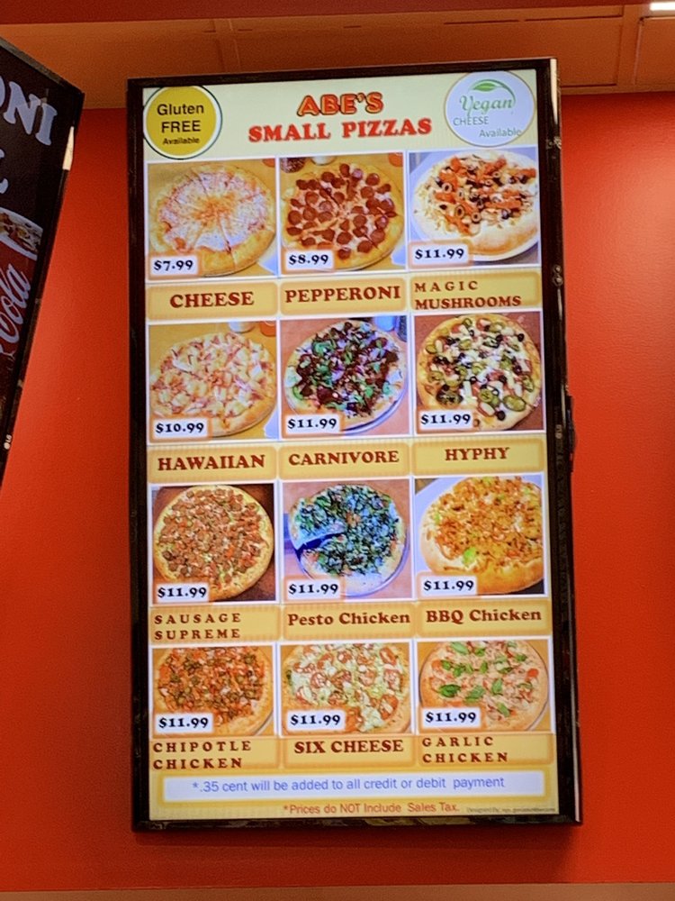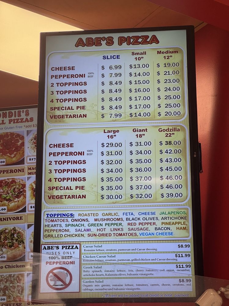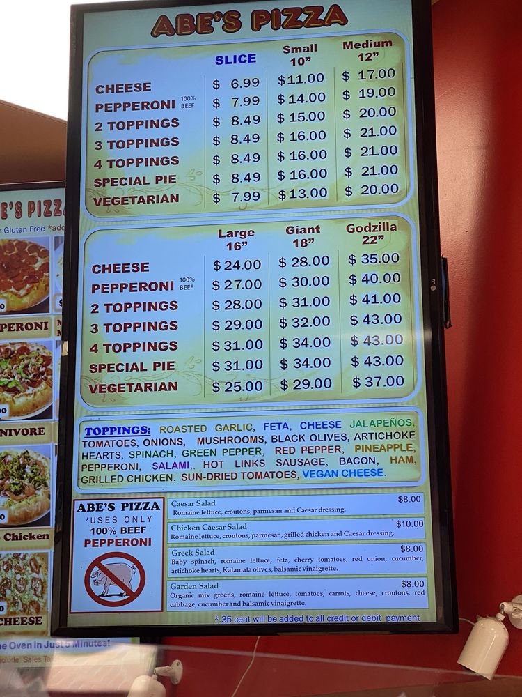 Abe's offers more than just slices; the casual, tourist-friendly atmosphere is perfect for groups, with outdoor seating available. Customers appreciate the generous portion sizes, as echoed in reviews highlighting the "massive" slices and flavorful toppings. With a variety of payment options including Android Pay and Apple Pay, as well as delivery, takeout, and catering services, Abe's Pizza is a convenient choice for any pizza lover. Discover why visitors rave about returning to this gem of a pizzeria!